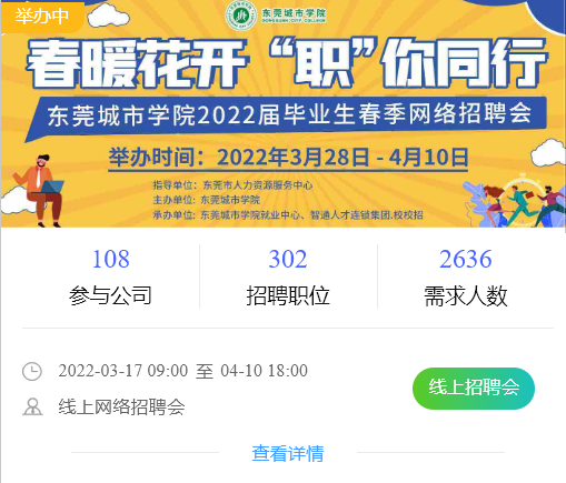 从3月份截至目前,就业中心全面布局,多措并举,共克时艰,以访企脱岗专项行动作为契机,结合线上开拓就业新天地,通过举办“春暖花开 ‘职你同行”BV伟德官方网站2022届毕业生春季网络招聘会、轻喜到家2022春季校园BV伟德官方网站专场宣讲会、东莞联通城市学院专场宣讲会、中国银行东莞分行BV伟德官方网站专场宣讲会、爱旭股份2022届校园招聘BV伟德官方网站专场宣讲会、宜得利家居聘BV伟德官方网站专场宣讲会,结合公众号、企业微信、微信群等多渠道发布,共对接188家企业,提供634个岗位,需求人数为4727人,为毕业生开源拓岗,校企双方建立常态化交流互访机制,为企业的高质量发展持续输送更多优秀人才,实现校企共赢发展。