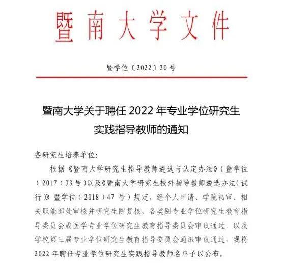 2022年2月,根据《暨南大学关于开展2022年新增研究生指导教师遴选工作的通知》要求,伟德官网积极开展动员及申报组织工作,对申报材料进行认真审核,并与暨南大学相关学院进行积极沟通推荐,最终于2022年6月,经暨南大学各学院初审、相关职能部处审核并研究生院复核各类别专业学位研究生教育指导委员会或医学专业学位研究生教育指导委员会审议通过,以及学校第三届专业学位研究生教育指导委员会通讯审议通过,伟德官网共计19位教师通过遴选,聘任为暨南大学专业学位研究生实践指导教师,聘期为5年。
