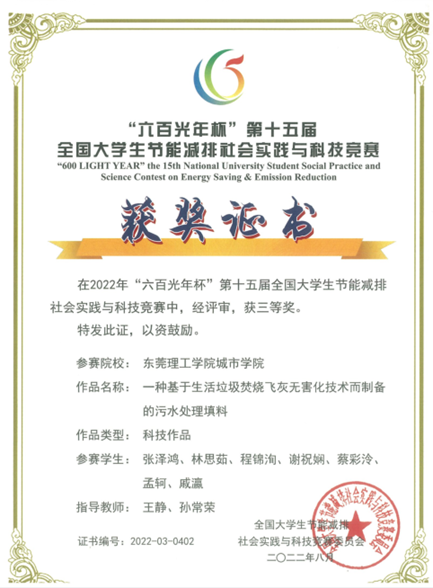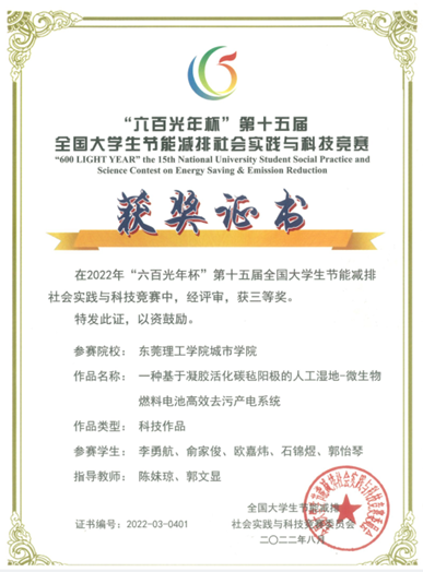 近日,由教育部高等教育司主办的“六百光年杯”第十五届全国大学生节能减排社会实践与科技竞赛决赛在天津大学落下帷幕。本届大赛共有来自清华大学、浙江大学、哈尔滨工业大学等623所高校的四万余名学生的5373件科技作品参赛,经过激烈的角逐,伟德官网城建与环境学院学生团队获得三等奖2项,取得广东省民办高校此项赛事最好成绩。获奖项目分别为《一种基于凝胶活化碳毡阳极的人工湿地—微生物燃料电池高效去污产电系统》、《一种基于生活垃圾焚烧飞灰无害化技术而制备的污水处理填料》。
