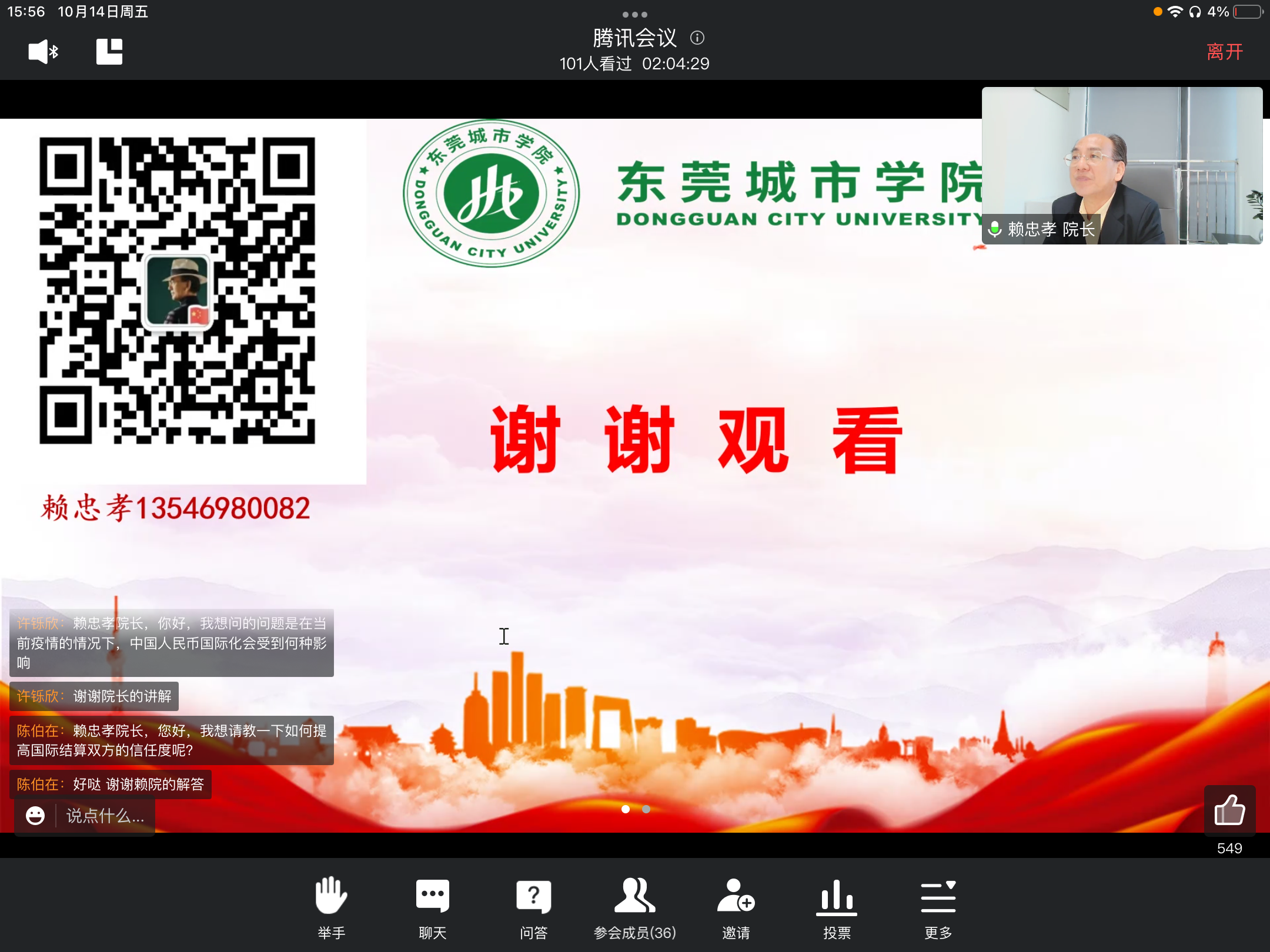 讲座之后,与会者积极发言,就如何提高国际结算双方的信任度,疫情是否会对人民币国际化造成影响等提出自己的疑问,赖忠孝教授一一解答,让与会者收获满满。