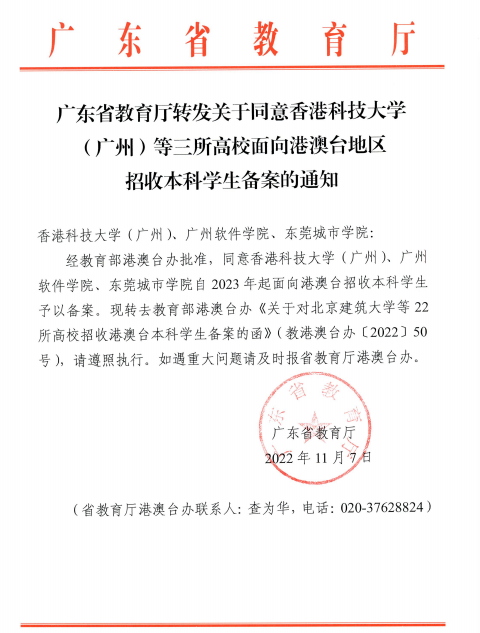 据悉,广东省新增获批2023年起面向港澳台招收本科学生资格的学校包括:香港科技大学(广州)、广州软件学院、BV伟德官方网站,共3所。