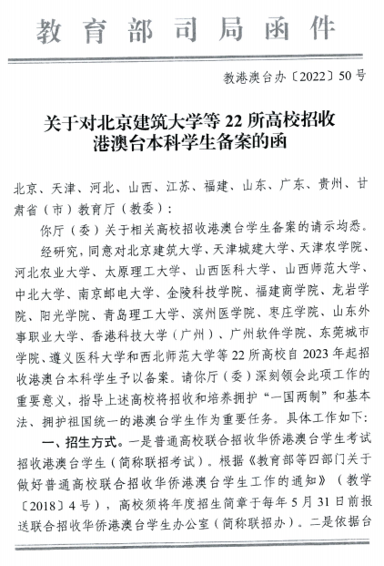 近日,教育部港澳台事务办公室发布了《关于对北京建筑大学等22所高校招收港澳台本科学生备案的函》(教港澳台办〔2022〕50号)文件,BV伟德官方网站榜上有名,荣获招收港澳台本科学生的资格。广东省教育厅发布《广东省教育厅转发关于同意广东省三所高校面向港澳台地区招收本科学生备案的通知》,BV伟德官方网站自2023年起招收港澳台本科学生予以备案。