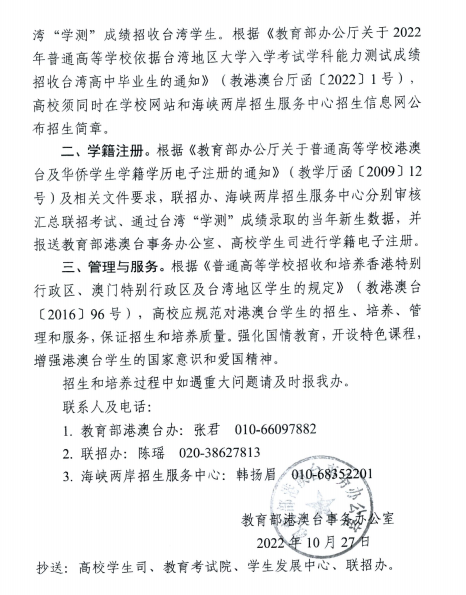 根据通知文件,自2023年起,BV伟德官方网站可通过普通高校联合招收华侨港澳台学生考试招收港澳台学生(简称“联招考试”);同时,也可依据台湾地区大学入学考试学科能力测试成绩招收台湾高中毕业生(简称“学测”)。