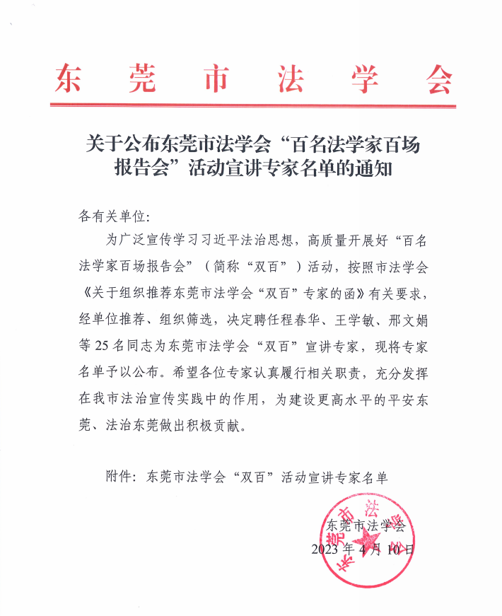近日,东莞市法学会发文公布“百名法学家百场报告会”(简称“双百”)宣讲专家,伟德官网刘杰教授和李阳桂博士与来自市委党校、法院、东莞理工学院等单位的25人获聘为“双百”宣讲专家。