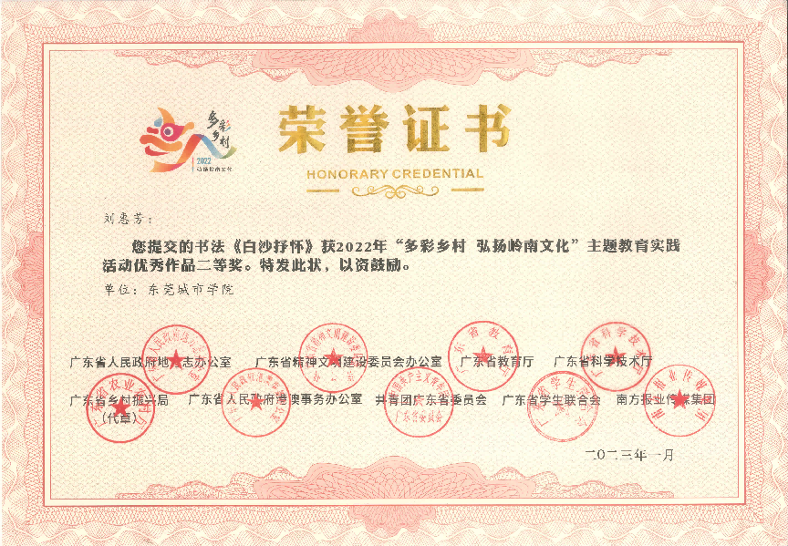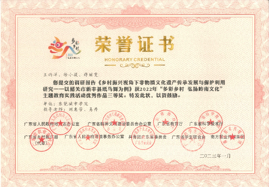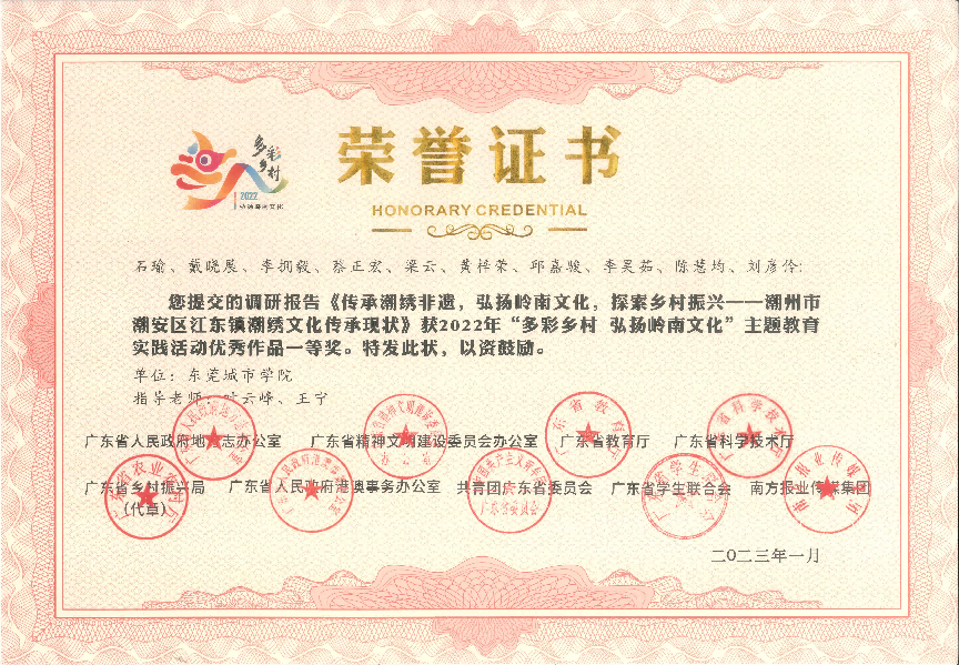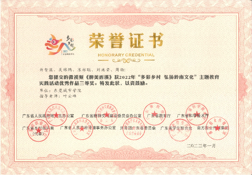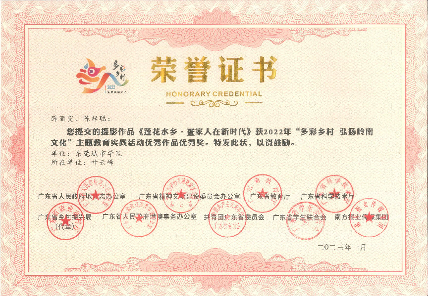 近日传来喜讯!在2022年,由广东省人民政府地方志办公室、广东省精神文明建设委员会办公室、广东省教育厅、广东省科学技术厅、广东省乡村振兴局、广东省人民政府港澳事务办公室、共青团广东省委员会广东省学生联合会、南方报业传媒集团联合组织开展的 2022年“多彩乡村 弘扬岭南文化”主题教育实践活动中,伟德官网获得一等奖1项,二等奖1项,三等奖2项,优秀奖1项,并获优秀组织单位。