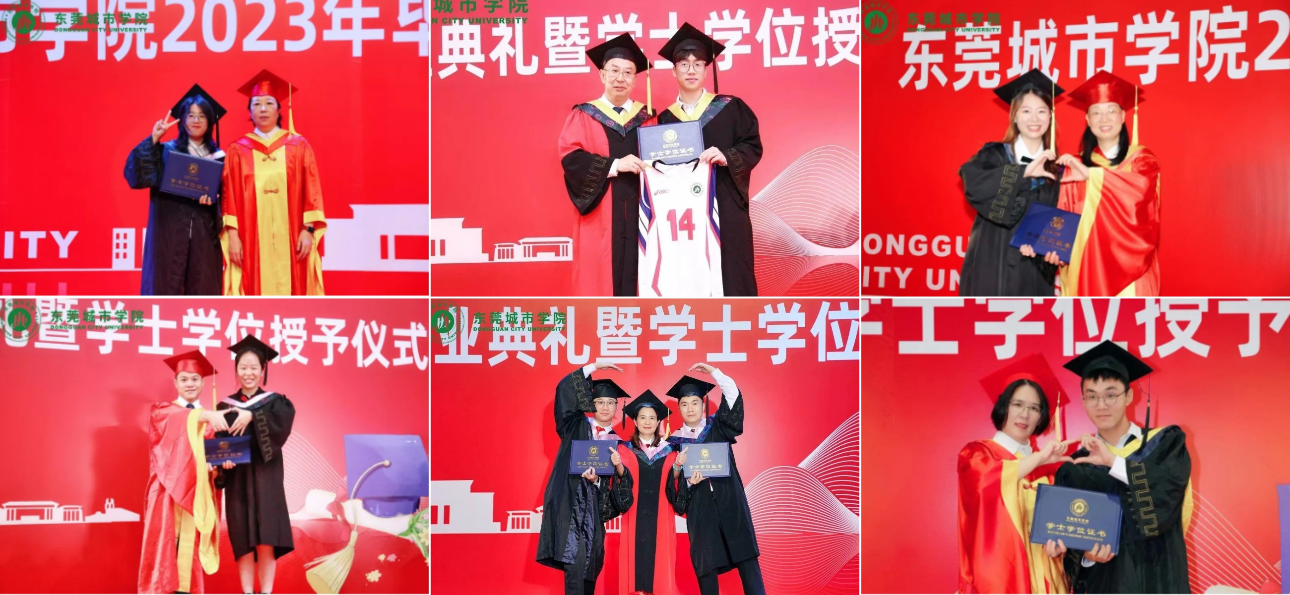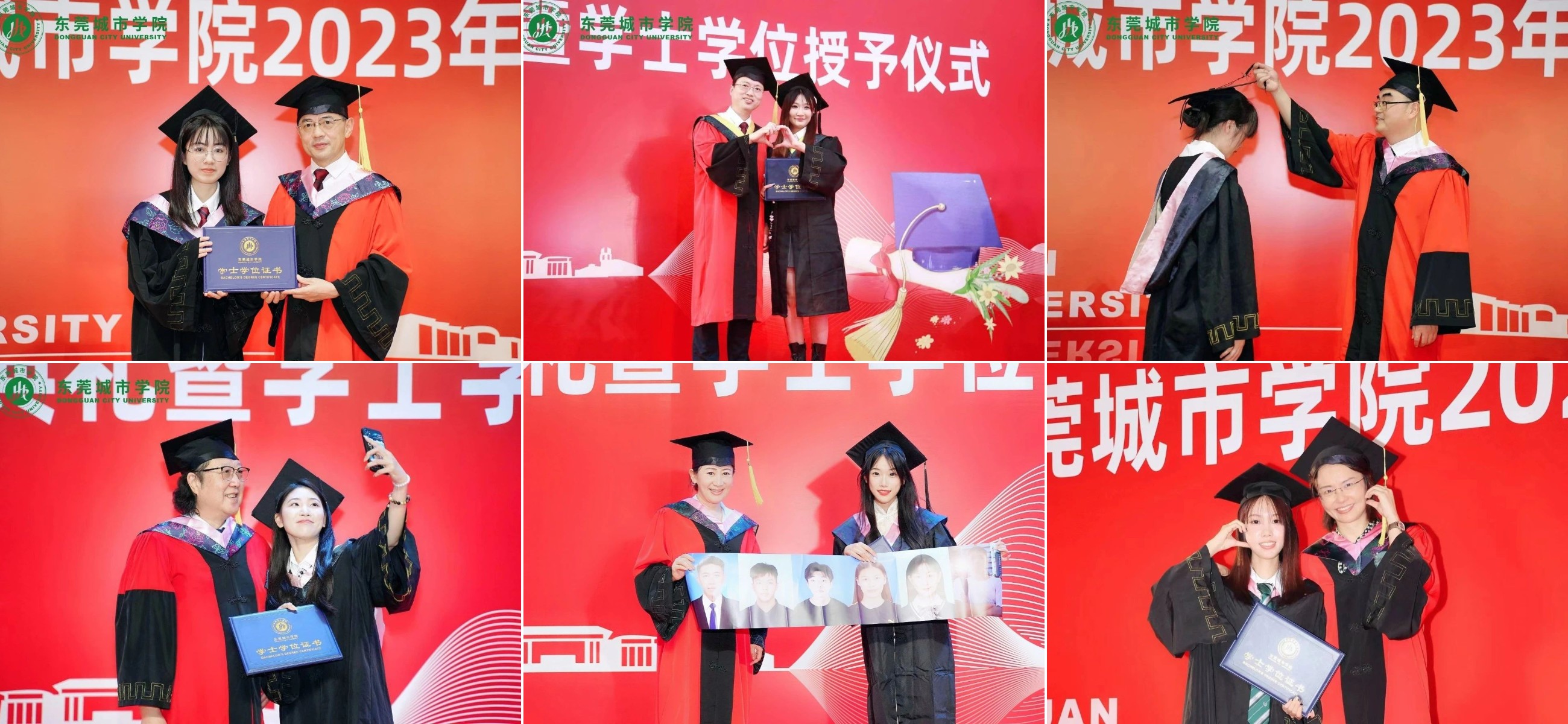 仪式上,毕业生们纷纷与学士学位评定委员互动留影,做出拥抱、花式比心、剪刀手、竖大拇指等动作,大家纷纷拍照留念,记录下这一珍贵的时刻。