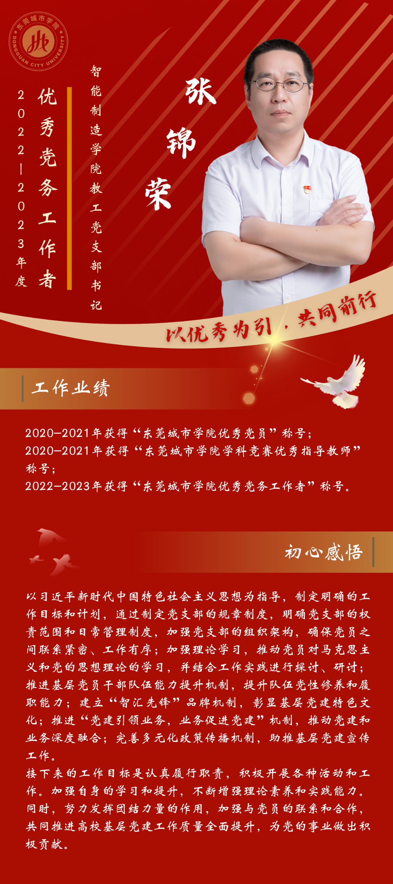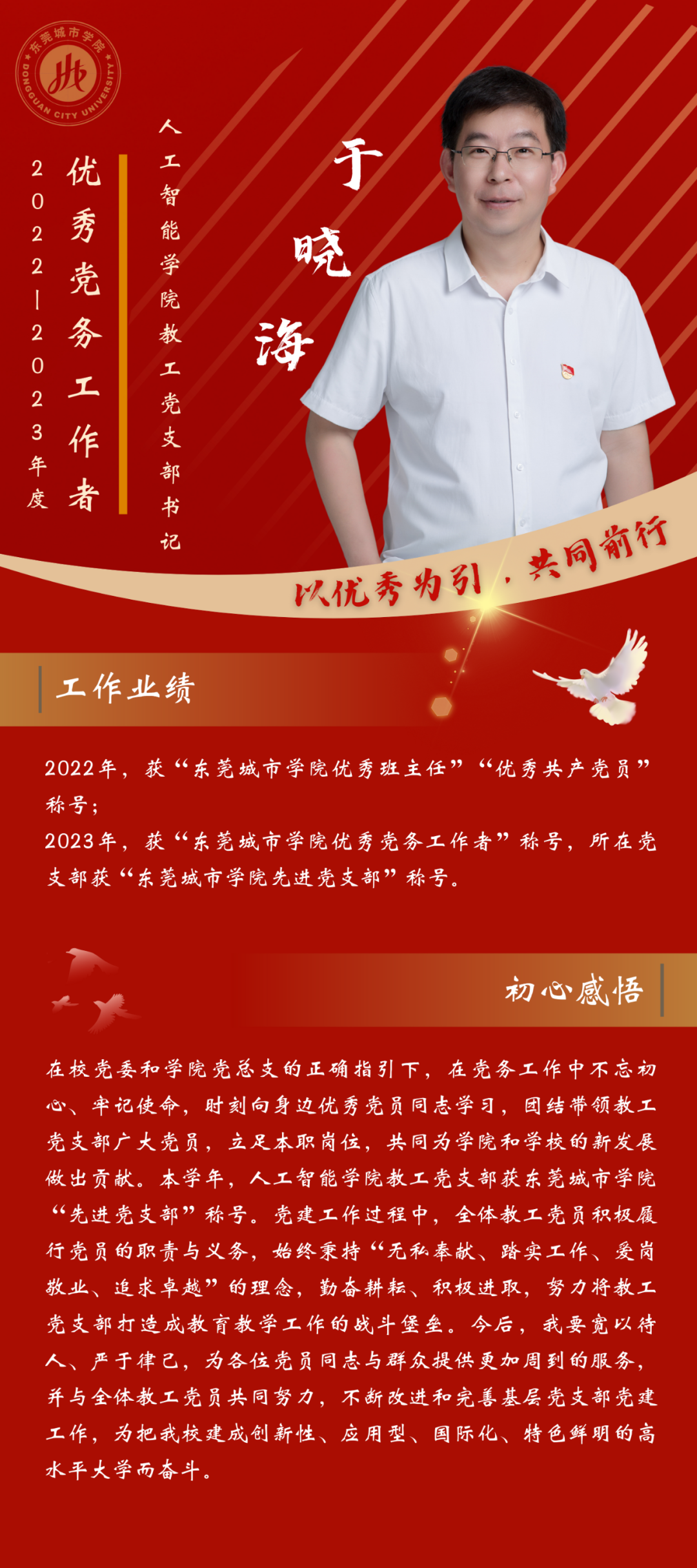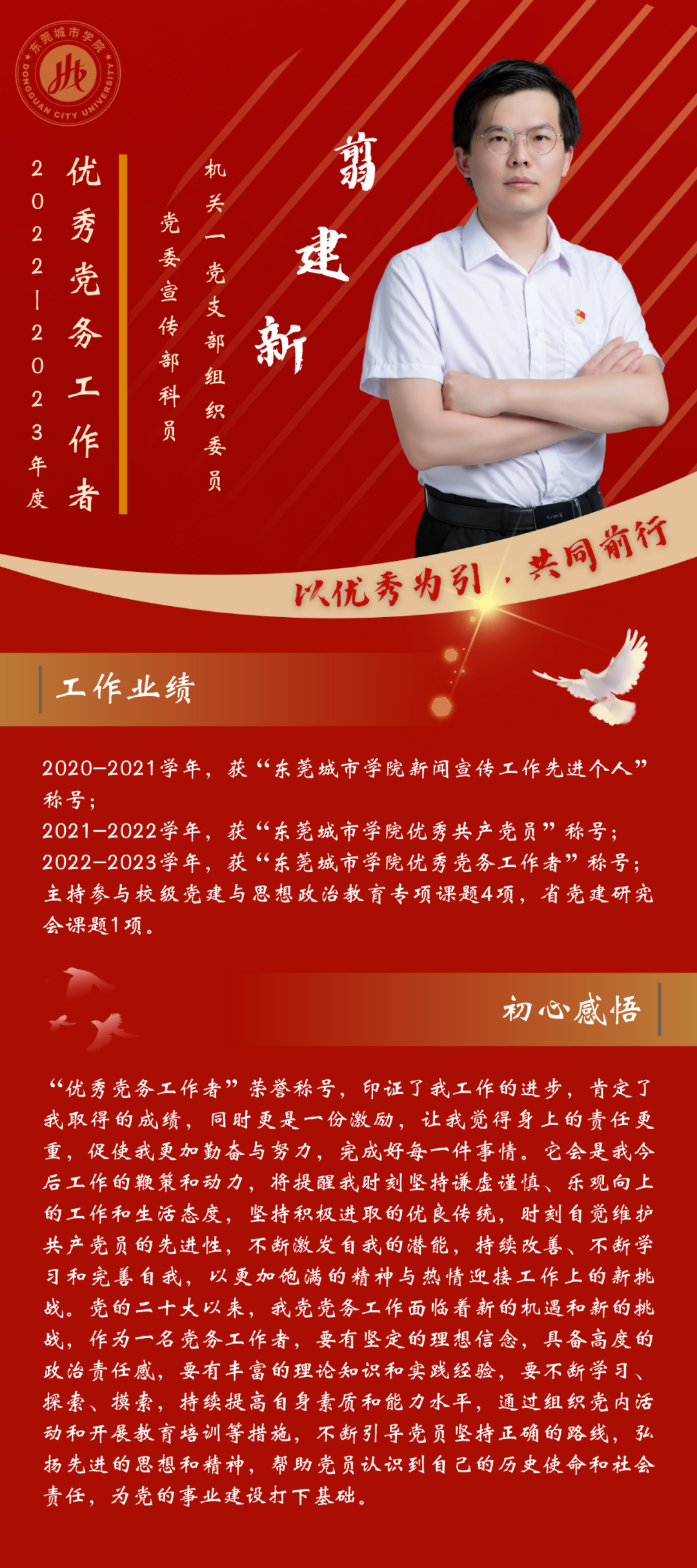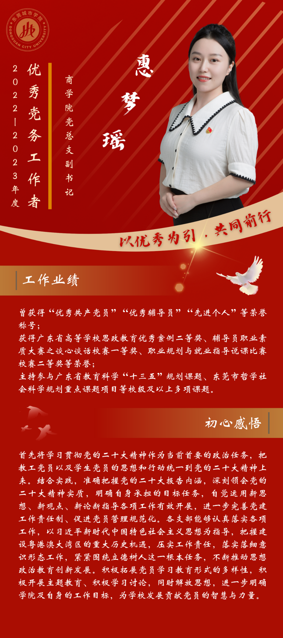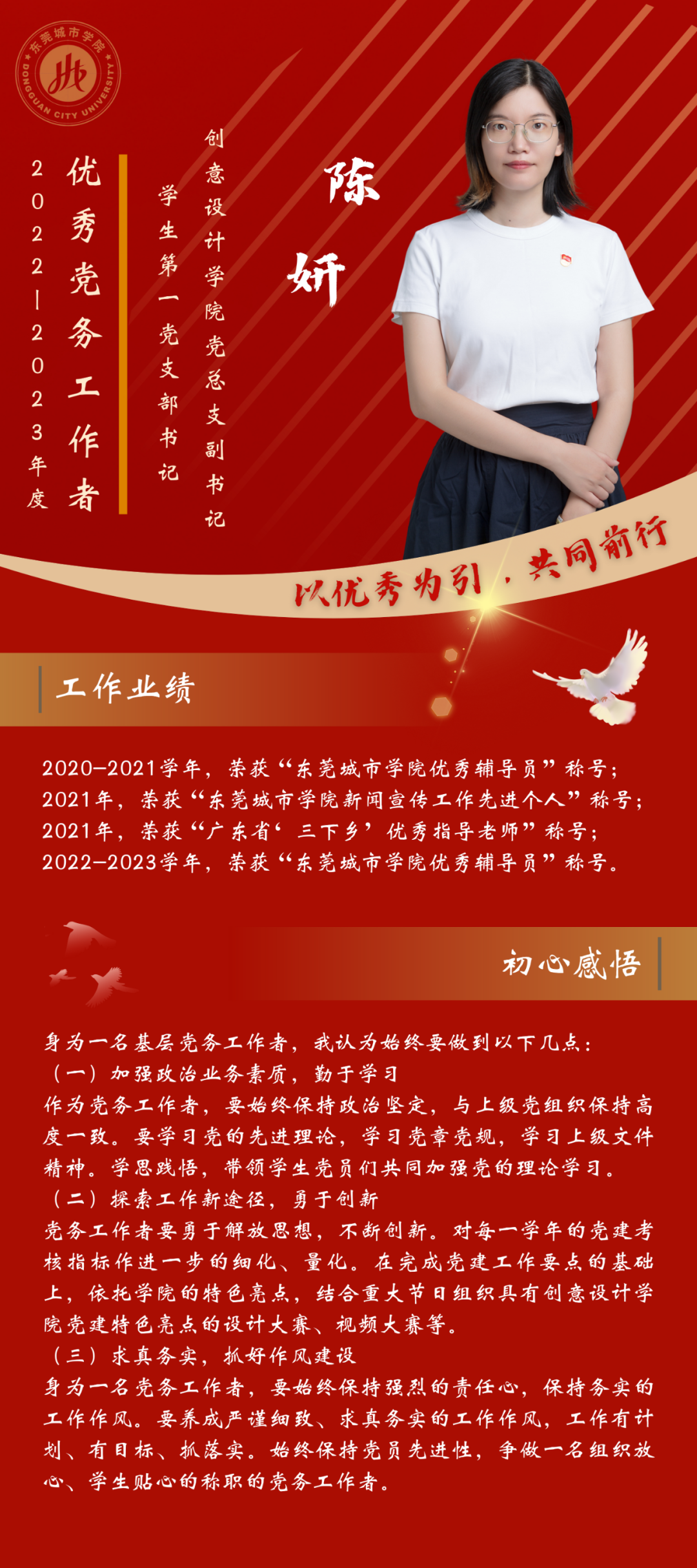 一名党员,就是一面旗帜。为发挥先进典型的示范作用,弘扬党的光荣传统和优良作风,我们推出“优秀党务工作者”风采展,充分展示伟德官网广大党员干部坚守初心使命、勇于担当作为的政治本色。让我们向优秀学习、向先进看齐,在新时代新征程中展现新作为新担当,不断开创学校教育事业发展新局面。