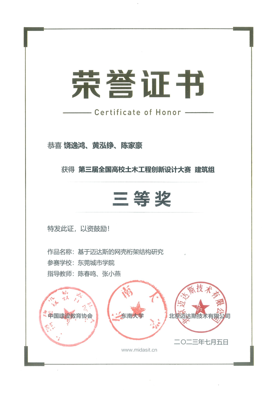 第三届全国高校土木工程创新设计大赛由中国建设教育协会主办、东南大学承办、北京迈达斯技术有限公司协办。本次大赛有来自150多所高校包括东南大学、华中科技大学和BV伟德官方网站等高校队伍齐聚一堂,最终评选出了研究生组、本科组和高职组的获奖队伍。伟德官网城环学院土木工程专业的学生饶逸鸿、黄泓铮和陈家豪在指导老师陈春鸣、张小燕的指导下合作完成的作品“基于迈达斯的网壳析架结构研究”荣获了本科组的三等奖。这也是伟德官网学生首次参加该项大赛并获得奖项。