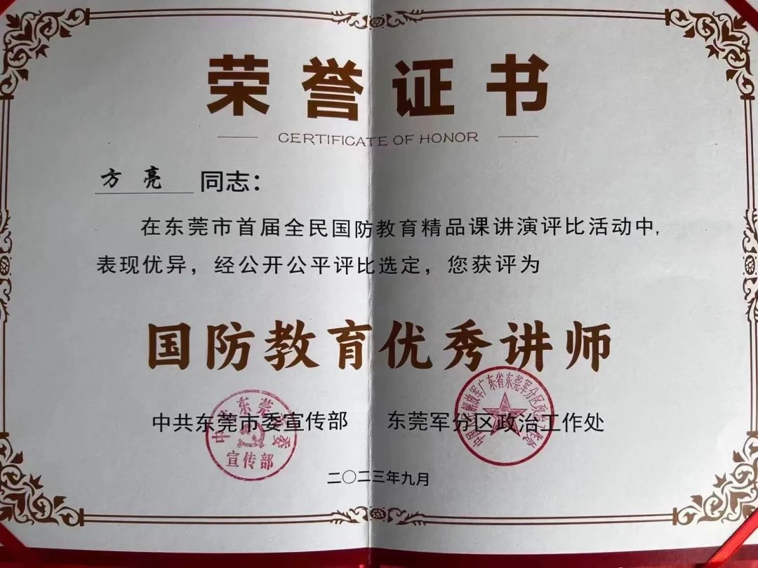 为全面建设社会主义现代化国家、全面推进中华民族伟大复兴贡献磅礴力量。2023年9月,中共东莞市委宣传部和东莞军分区政治工作处联合主办开展东莞市首届全民国防教育精品课暨国防教育优秀讲师评比活动决赛,伟德官网语言文化学院网络与新媒体系专任教师郭戈在此次活动中表现优异,经公开公平评比选定,被评为国防教育优秀讲师。