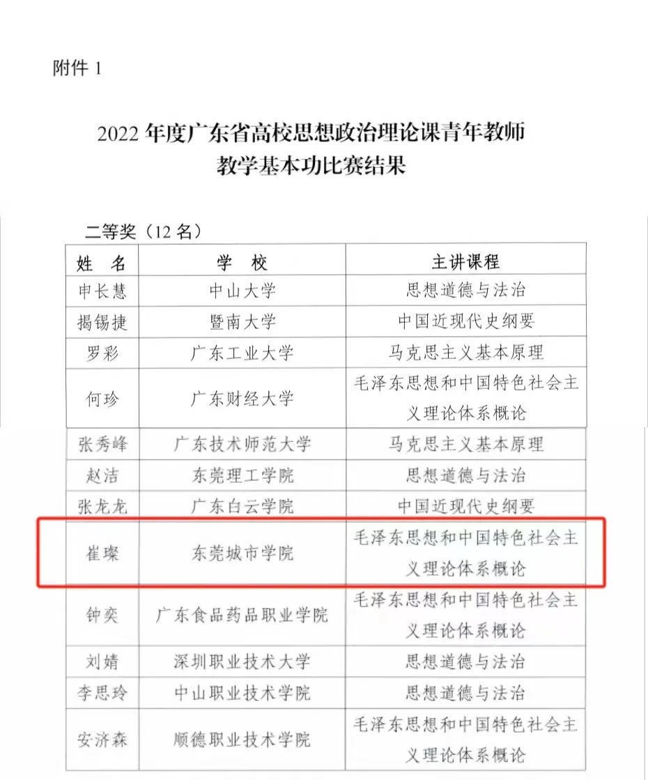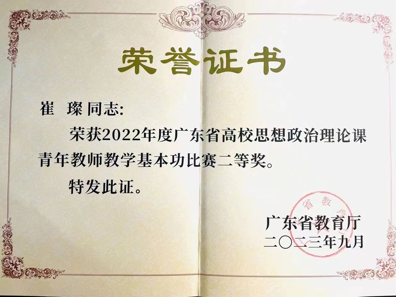 近日传来喜讯!广东省教育厅公布2022、2023年度广东省高校思想政治理论课青年教师教学基本功比赛结果。伟德官网马克思主义学院教师崔璨老师获得2022年度广东省高校思想政治理论课青年教师教学基本功比赛二等奖,同广东省众多公办和民办本科院校同台竞技,并获此殊荣。本次大赛取得的成绩,再次证明了伟德官网教师的教学能力!