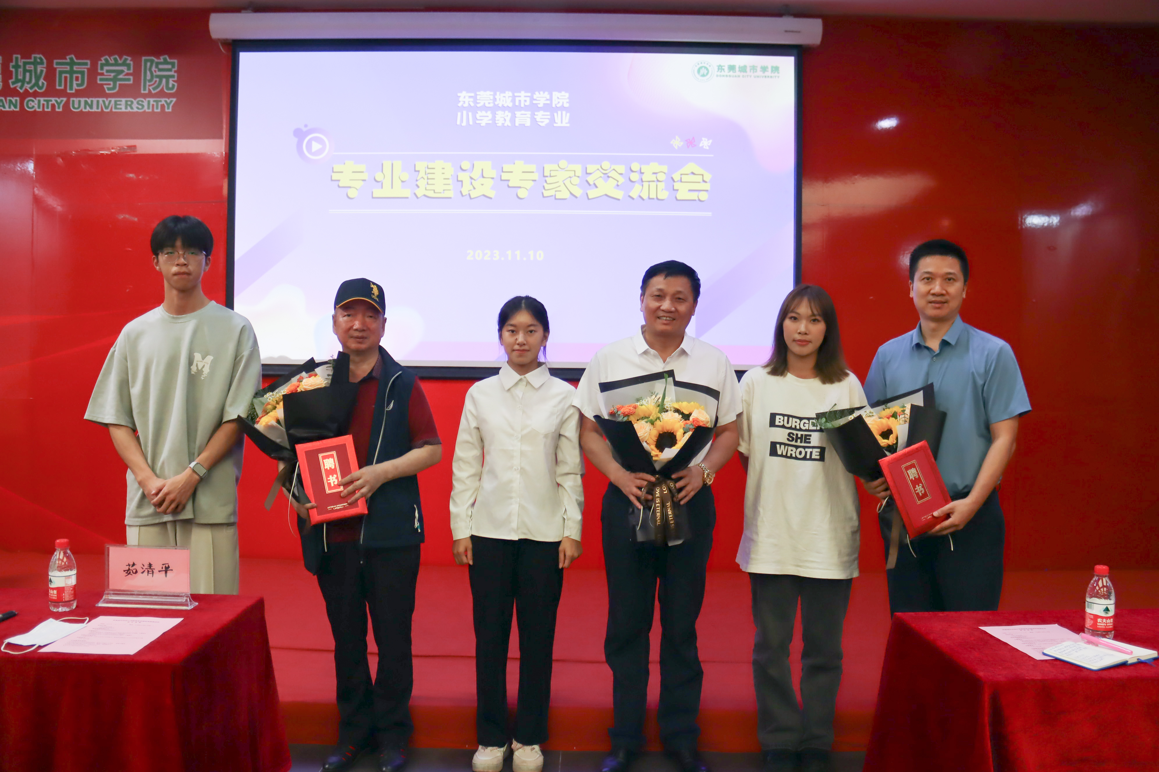 方伟华常务副校长为茹清平教授和谭贵新教授颁发特聘教授证书,伟德官网学生为他们献上鲜花。