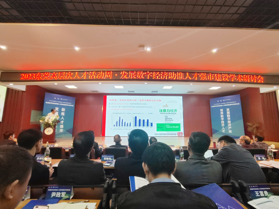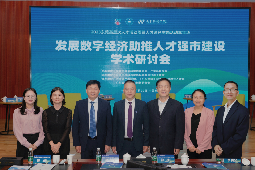 2023年11月29日上午,发展数字经济助推人才强市建设学术研讨会在广东科技学院南城校区举行。本次活动是“2023东莞高层次人才活动周暨人才嘉年华”系列活动之一,由东莞市社会科学界联合会和广东科技学院主办,东莞市社科名家陈标新数字经济工作室承办,旨在探讨交流数字人才队伍建设新路径,为推动东莞数字经济高质量发展、建设“人才强市”贡献力量。东莞市委、市政府相关部门代表,中国社会科学院、武汉大学、对外经济贸易大学、中国电子技术标准化研究院等15所知名院校、研究机构的专家学者,以及来自粤港澳大湾区20余家数字经济类行业协会代表,60余家企业负责人,共500余人参会。