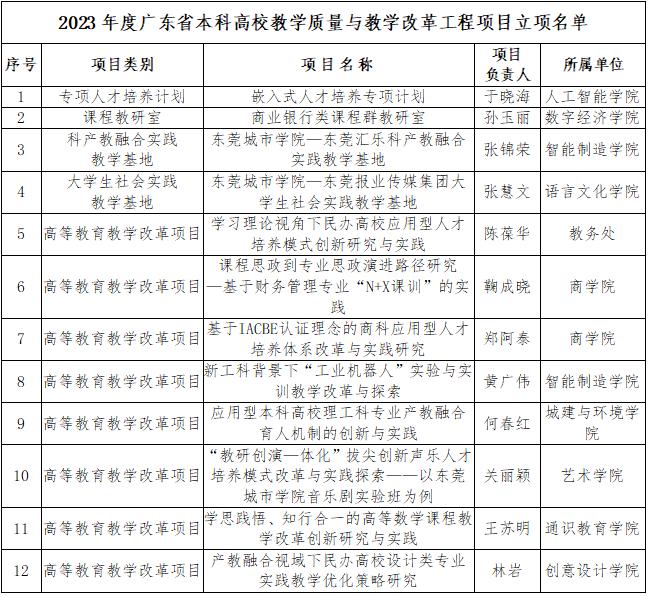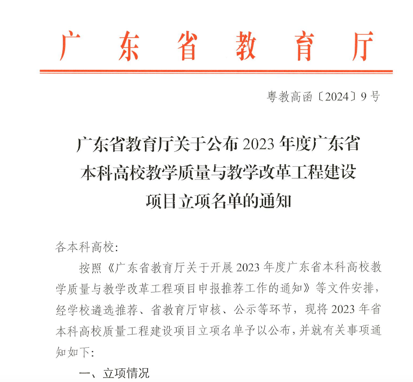 近日,广东省教育厅公布了2023年度广东省本科高校教学质量与教学改革工程项目立项建设名单(粤教高函[2024]9号),伟德官网申报的专项人才培养计划1项、课程教研室1项、科产教融合实践教学基地1项、大学生社会实践教学基地1项、高等教育教学改革项目8项等共12个项目全部入选为省级建设项目,立项率为100%。
