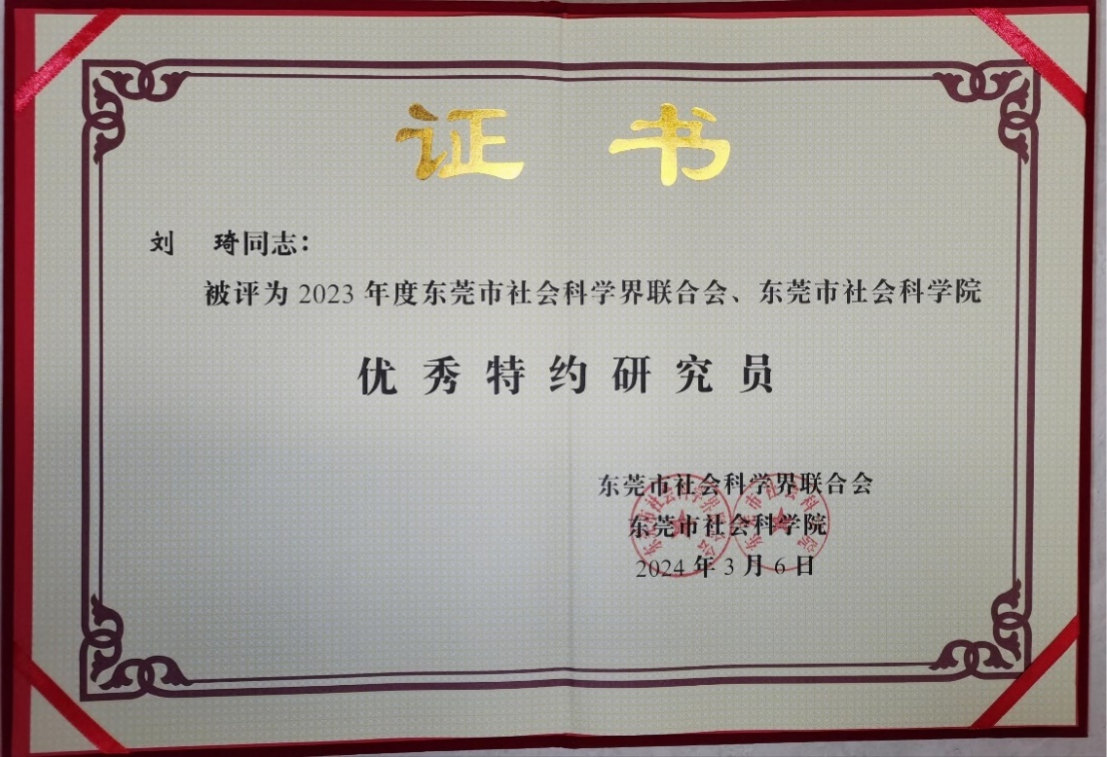 特约研究员是东莞市社科联、社科院科研智库的重要力量,在全市范围内择优评选产生。刘琦副教授主要从事技术经济管理、科技创新体系研究,获聘特约研究员以来,发表多篇CSSCI、SSCI及核心论文,获得东莞市第四届哲学社会科学优秀成果奖,此奖项是中共东莞市委领导下开展的市级哲学社会科学最高奖项,主持和参与多项咨政课题,为东莞地方经济发展建言献策。