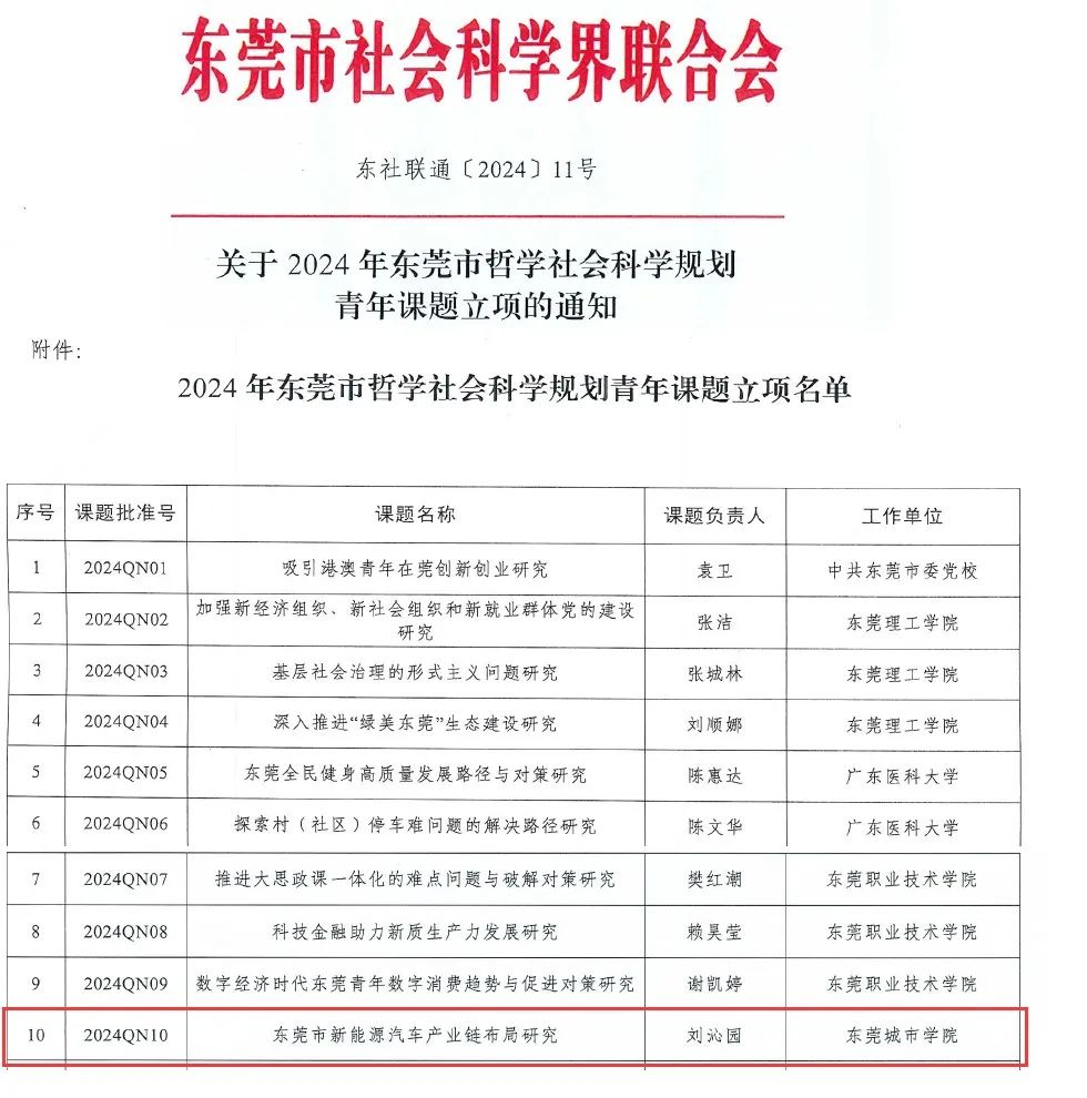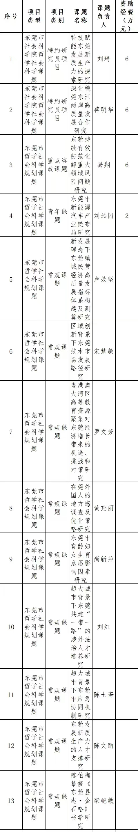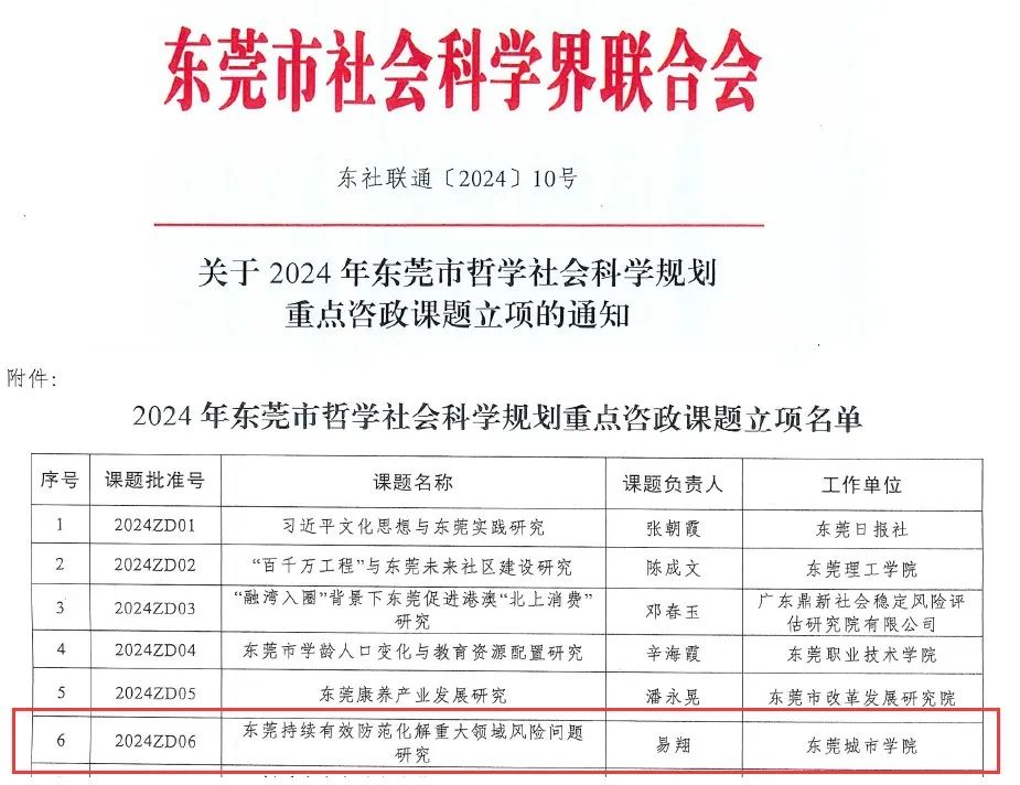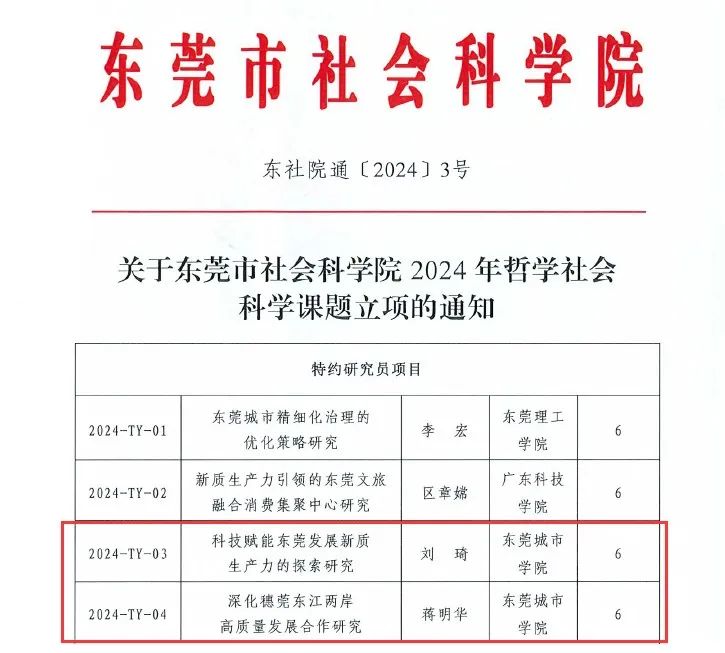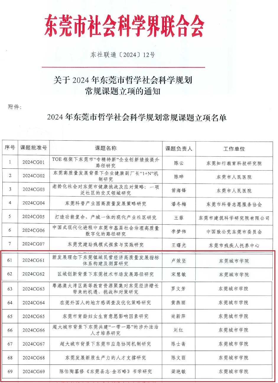 近日,东莞社科联和东莞市社科院分别公布了2024年东莞市哲学社会科学规划课题和东莞市社会科学院2024年哲学社会科学课题立项名单,伟德官网共有13项课题喜获立项,其中特约研究员项目2项,重点资政课题1项,青年课题1项,常规课题9项,获资助经费共计20万元,具体立项名单见下表: