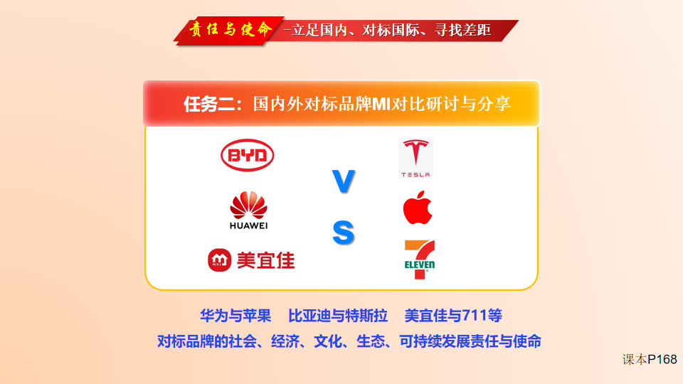 其次,引导学生立足国内、对标国际,探讨国内外对标品牌的责任与社会使命内涵,探究差距,为我国品牌出海设计品牌识别系统做好铺垫。