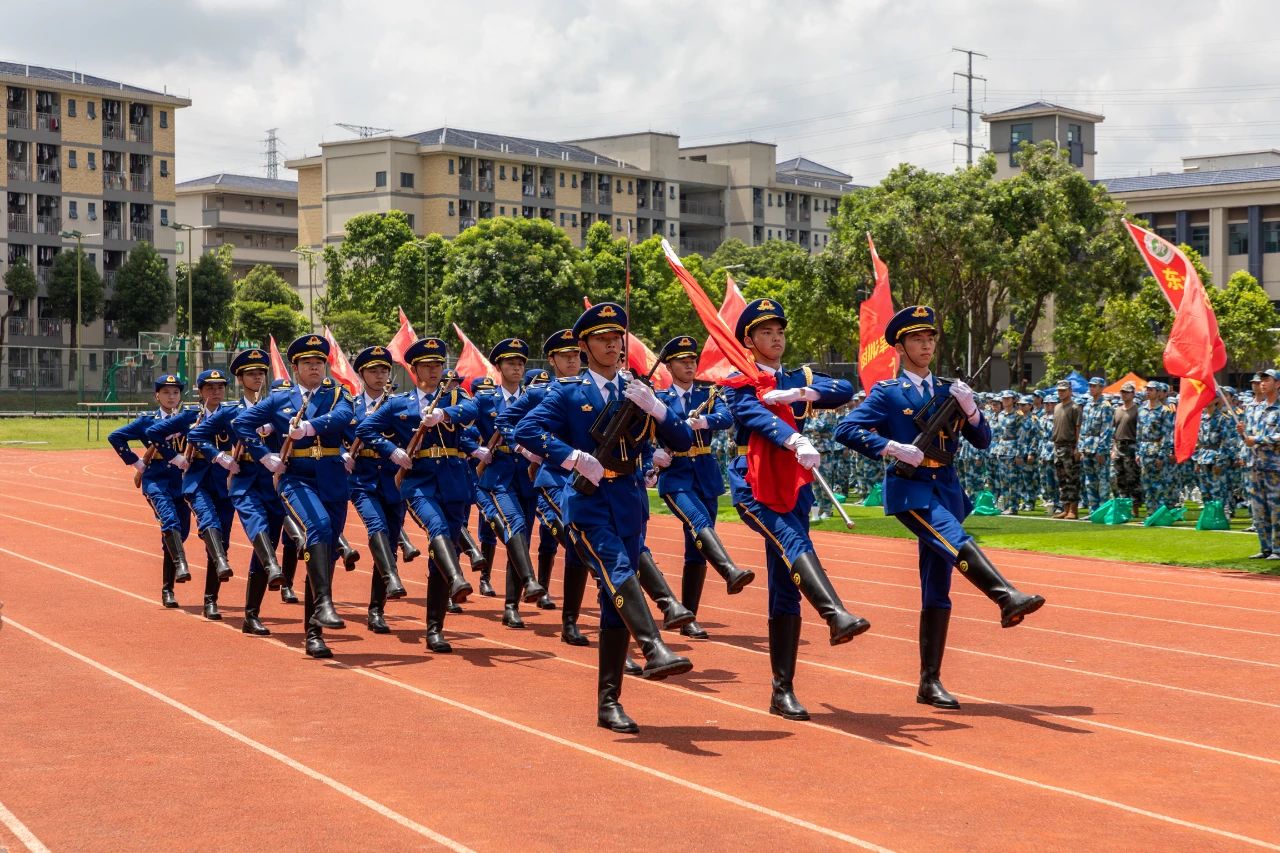 军训开营仪式在庄严的升国旗、奏国歌仪式中拉开帷幕。全体肃然而立,五星红旗在国歌声下冉冉升起,各班列队严阵以待、蓄势待发。