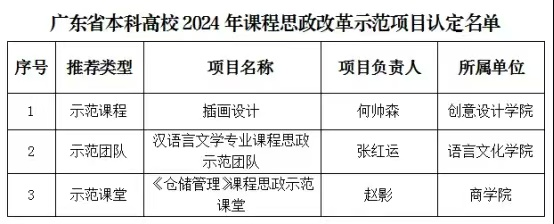 近日,广东省教育厅公布了2024年度本科高校课程思政改革示范项目认定名单(粤教高函〔2024〕27号),伟德官网推荐的示范团队、示范课程、示范课堂共3个项目全部获省厅认定为省级课程思政改革示范项目,其中何帅森老师的《插画设计》示范课程,同时认定为省级一流本科课程(课程思政),截止目前伟德官网共有20门一流课程获得省厅认定。
