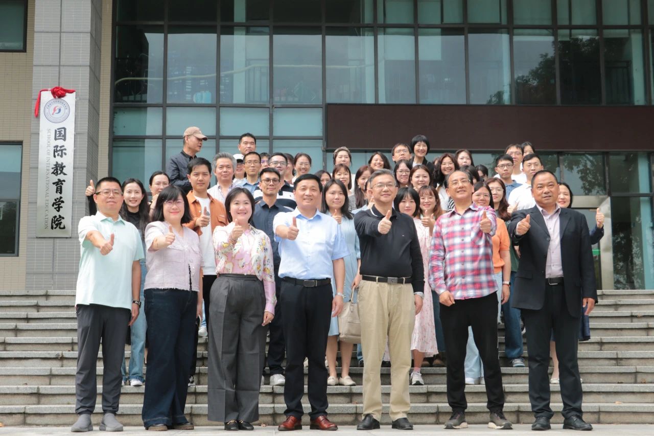 各位领导以及师生代表在国际教育学院的牌匾旁合影留念。