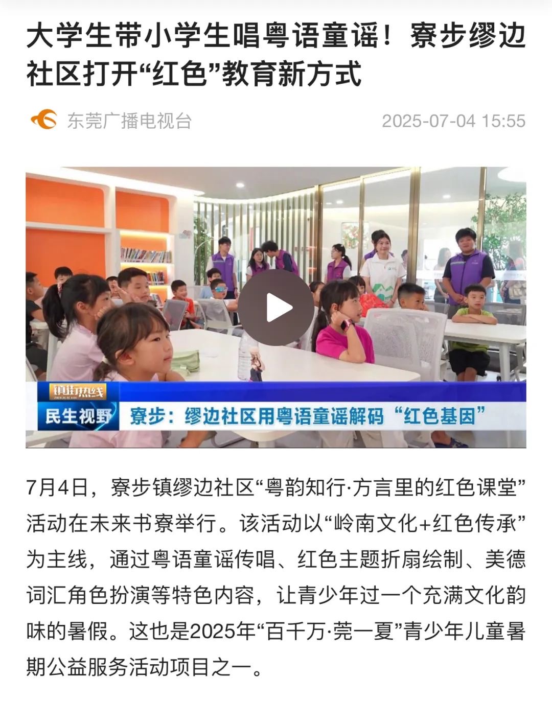 7月4日,寮步镇缪边社区“粤韵知行・方言里的红色课堂”活动在未来书寮正式启动。作为2025年“百千万・莞一夏” 青少年儿童暑期公益服务活动项目之一,该活动以“岭南文化 + 红色传承”为主线,通过粤语童谣传唱、红色主题折扇绘制、美德词汇角色扮演等特色内容,为青少年打造充满文化韵味的暑期体验。活动由BV伟德官方网站 “粤韵知行” 突击队策划,团队志愿者服务队具体实施,其创新形式与育人成效吸引了东莞广播电视台关注报道。