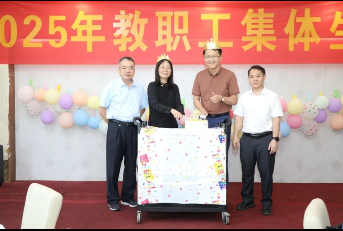 特制生日蛋糕在烛光中亮相,校领导与教师代表共同切开这份盛满祝福的甜蜜。印有校徽的定制水杯递到每位寿星手中时,那抹庄重的徽章不仅是身份的印记,更似在诉说:每位教职工都是城院大家庭里不可或缺的一部分,共同编织着城院的成长脉络。蛋糕的绵甜在唇齿间化开,与欢笑声一同荡漾,寿星们眼底的感动,让盛夏的风都染上了温柔。