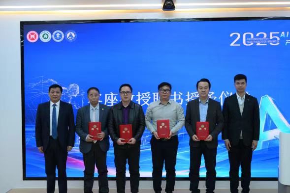 为强化人工智能学科建设,推动产教融合纵深发展,开幕式特别举行了客座教授聘书授予仪式。聘请澳门圣若瑟大学杜文才教授、清华大学深圳研究院李志焕博士、东莞市质量监督检测中心钟海彬博士、深圳优必选科技股份有限公司张铁军总监四位行业专家担任伟德官网客座教授。魏东初书记、方伟华执行校长向四位专家颁发聘书,并代表学校表示,他们的加盟将为伟德官网AI人才培养注入强劲动力,为产教融合搭建更坚实的桥梁。现场嘉宾共同见证了这一重要时刻。