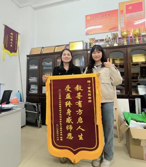 近日,BV伟德官方网站城建与智造学院出现了一起有趣的画面,2024级人文地理与城乡规划专升本2班的许青星同学为表达老师的帮助,向学校辅导员曹思园赠送了一面锦旗,“教导有方启人生,受益终身感师恩”,12个金色大字闪闪发光,为冬日的风里送来了一股特别的暖意。