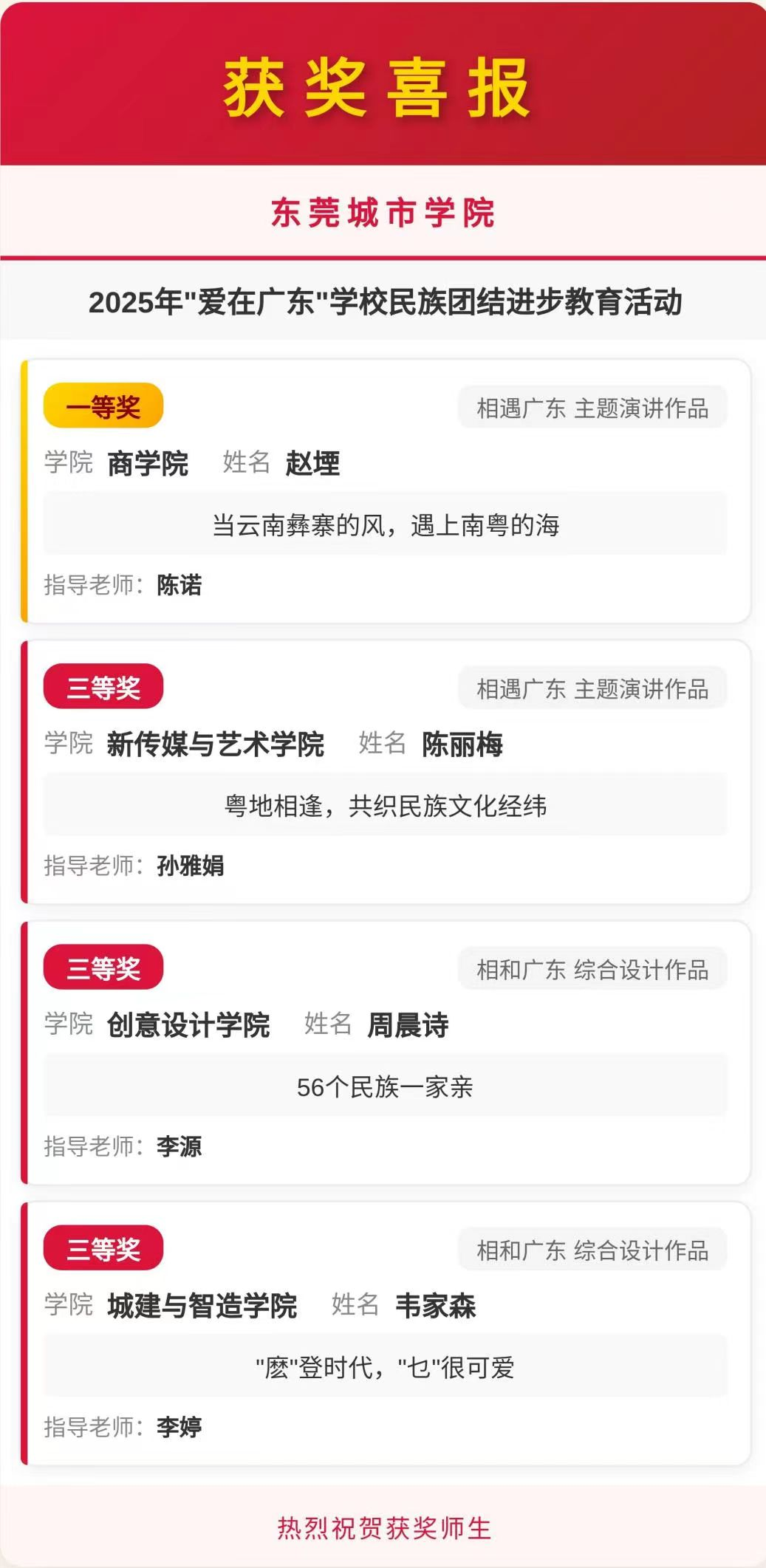 此次“爱在广东”活动取得的优异成绩,正是伟德官网长期以来扎实推进民族团结进步教育工作的生动体现。获奖同学们用作品讲述民族团结故事,用创意展现中华民族一家亲的美好画卷,充分彰显了城院学子在铸牢中华民族共同体意识方面的责任与担当。
