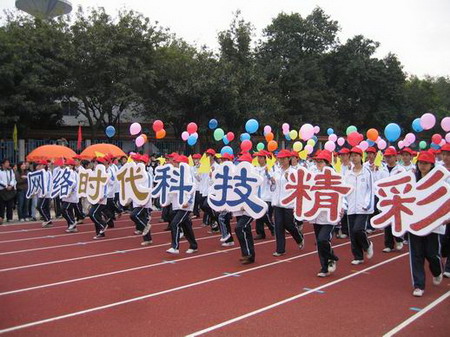 各运动员方队在行进中,运动员们不时地挥动着手中各具特色的道具,喊着雄壮有力的口号,为运动会增添了一道道亮丽的风景线,博得了与会人员热烈的掌声。