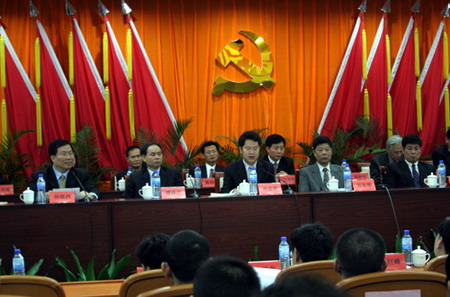 大会开幕式由杨晓西同志主持。下午3点,在庄严的国歌声中,中国共产党东莞理工学院第一次代表大会隆重开幕。中共东莞市委书记、市人大常委会主任刘志庚,广东省委组织部副厅级组织员万东明同志、广东省教育工委副书记谭泽中同志,中共东莞市委常委、组织部部长庞国梅同志,广东省委组织部干部五处何巨峰同志,中共东莞市直和机关工委书记苏群芳同志,广东省教育工委组织干部处副处长黄兆团同志,中共东莞市委组织部副部长陈柏南同志和我院领导杨晓西、王江水、黄碧莲、安少华、邹晓平、戴炳源等及全体党代表出席会议。东莞市委副书记、东莞理工学院临时党委书记刘树基同志作了党委工作报告。报告的题目是《加强党的建设 全面落实科学发展观 为建设有创新特色的名牌地方院校而努力奋斗》。