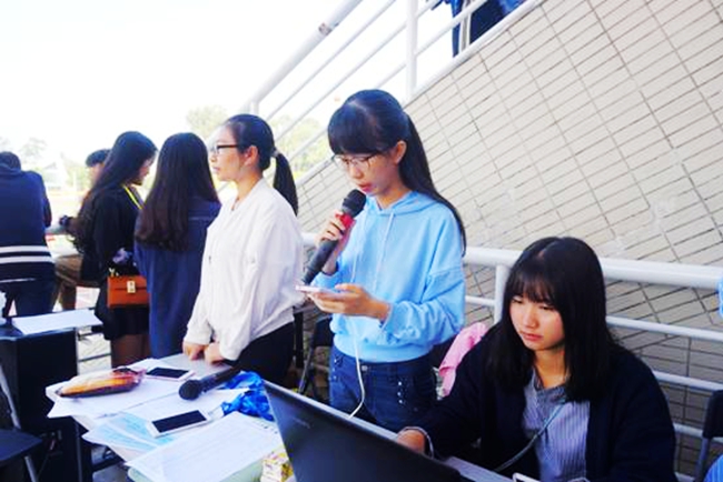 校运会正在火热进行,吸引了寮步电视台记者也来到现场进行采访报道。