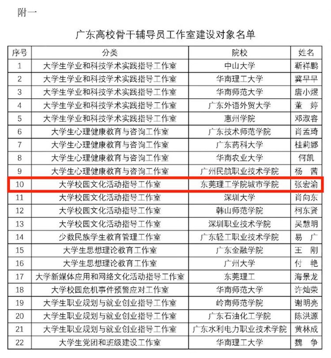 近日,从“广东学工”公众号获悉,我院两个辅导员工作室进入到广东省高校骨干辅导员工作室遴选公示阶段。其中,张宏渝老师的“大学校园文化活动指导工作室”入选“广东高校骨干辅导员工作室建设对象”,陈浩华老师的“大学生思想理论教育工作室”入选“广东高校骨干辅导员工作室培育对象”。这不仅实现了我院建院以来在此领域的新突破,“大学校园文化活动指导工作室”更是广东省独立学院填补了该领域的空白。