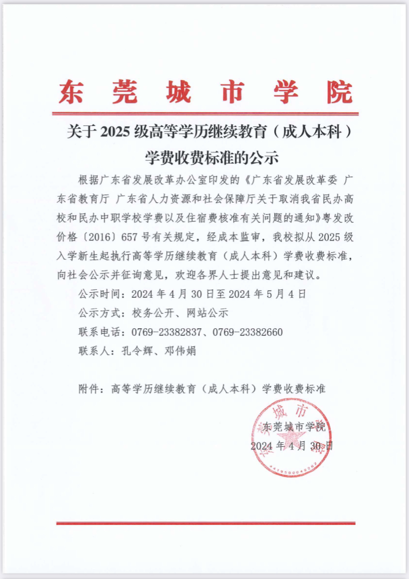 关于2025级高等学历继续教育(成人本科)学费收费标准的公示